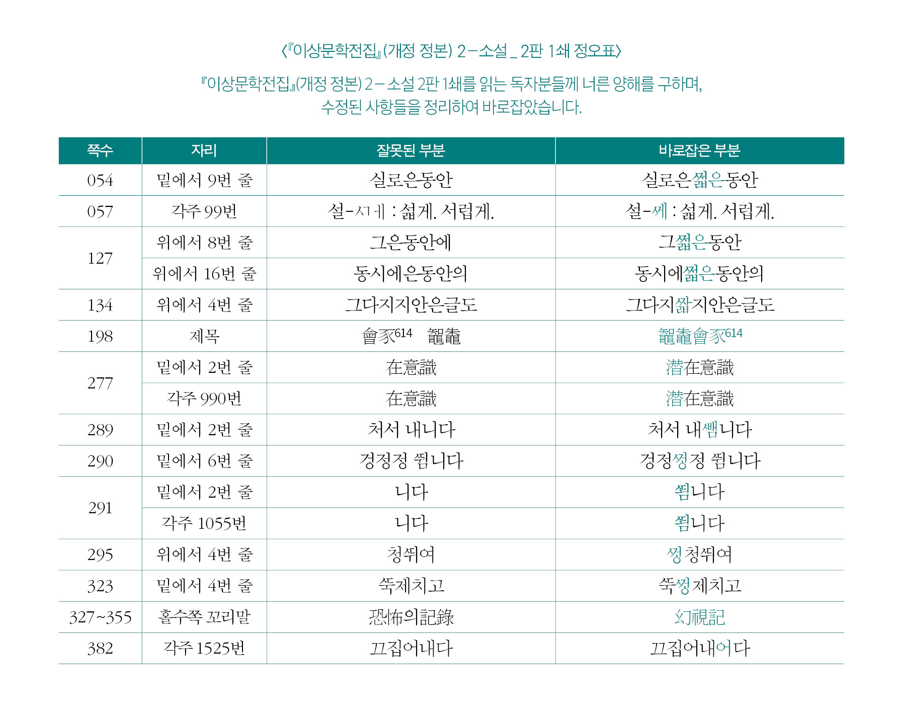 2025년 5월에 발간된 <개정 정본 이상문학전집 2-소설>(김주현 주해) 2판 1쇄의 일부 페이지에 옛한글과 한자 표기가 제대로 나오지 않았음을 확인하였습니다.