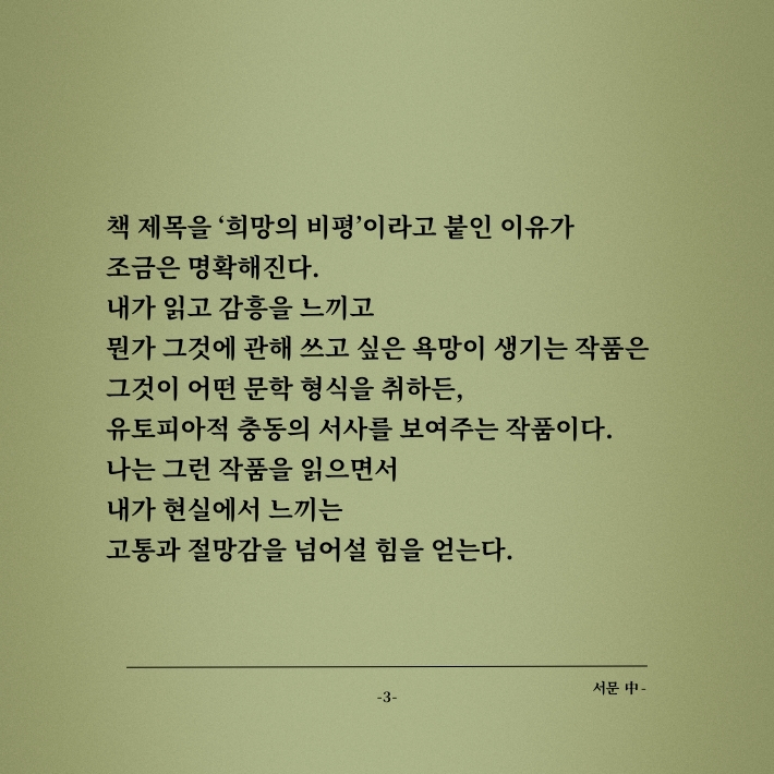유토피아적 충동의 서사를 보여주는 작품은 현실에서 느끼는 고통과 절망감을 넘어설 힘을 얻게 한다. 개인이 지각하는 현실에서 보이지 않는 것들, 하지만 현실이 품고 있는 것들, 대중의 눈앞에서 사라졌지만 되찾아야 할 것들, 아직 존재하지 않지만 존재해야 할 것들을 뛰어난 문학은 상상하고 형상화한다. 저자는 그러한 작품을 읽으면서 주어진 현실과 부딪칠 때 느끼는 비관주의를 달랠 희망을 찾는다.